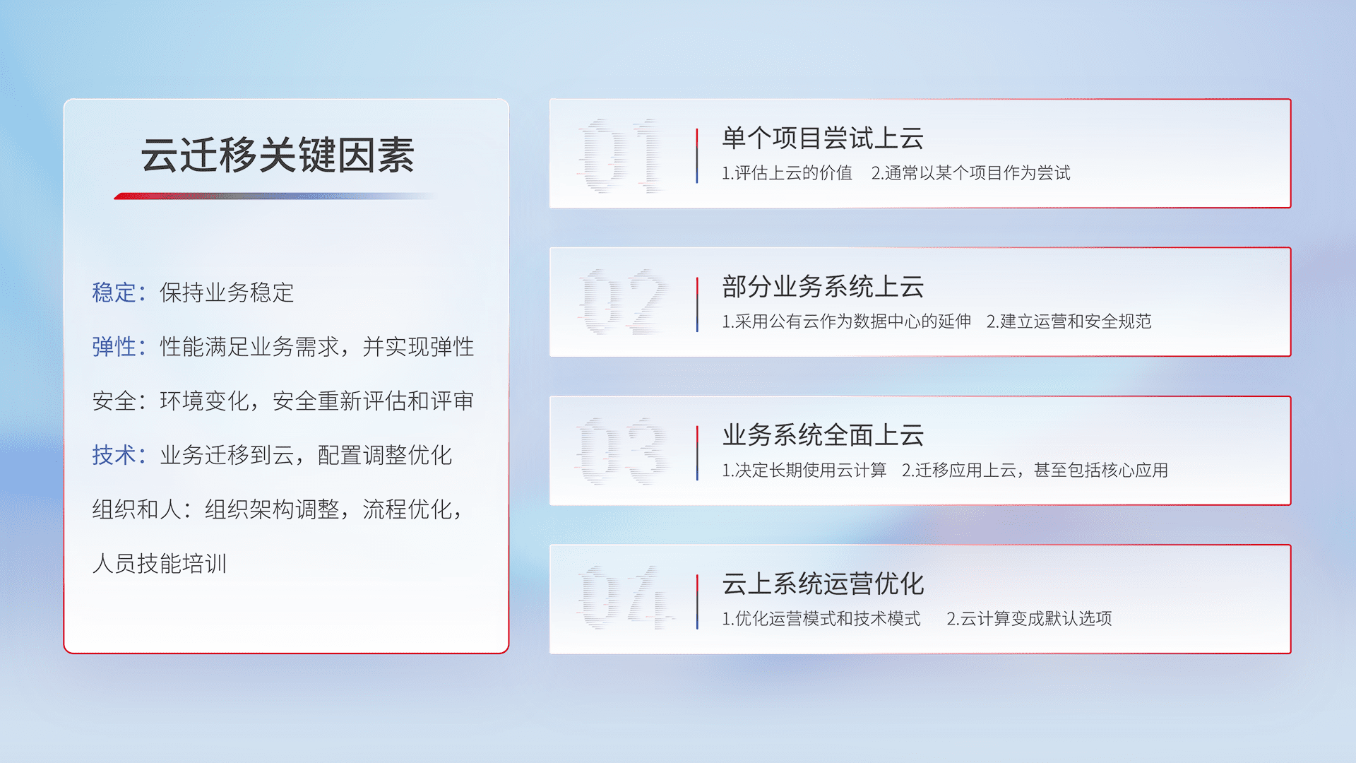 结合实际业务,,,,从规划设计、、、云平台选型、、、、云原生改造、、数据迁移、、、、集成交付,,,迁移全过程为客户识别最佳上云路径,,,,做好风险识别管理,,,,设计网络架构、、、身份权限、、、、安全审计合规、、、操作审计、、、、日志审计、、、监控告警策略、、多站点容灾设计等,,,对云上基础设施进行整体规划,,,,提升IT治理水平,,,以满足弹性、、、、高可用、、、高性能的需求。。