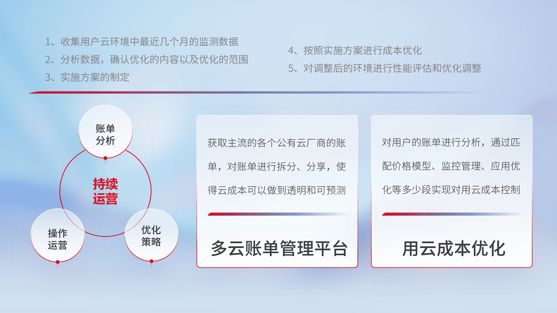 通过多云纳管,,,以统一的资源数据模型把客户的云资源进行抽象和封装,,,进而实现对多云资源的统一操作,,,保障云资源管理的可靠性、、、稳定性与可用性。。量身定制化运维内容,,,配置、、开发运维、、、、补丁管理、、备份、、、、监控、、、认证和访问管理、、、、审计和日常巡检等,,保障在用云过程中的可靠度,,稳定度以及高可用率。。。